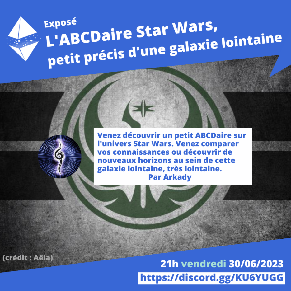 Venez nombreux vendredi 30 juin à 21 heures dans le salon vocal Activités découvrir un petit ABCDaire sur l'univers Star Wars, venez comparer vos connaissances ou découvrir de nouveaux horizons au sein de cette galaxie lointaine, très lointaine.