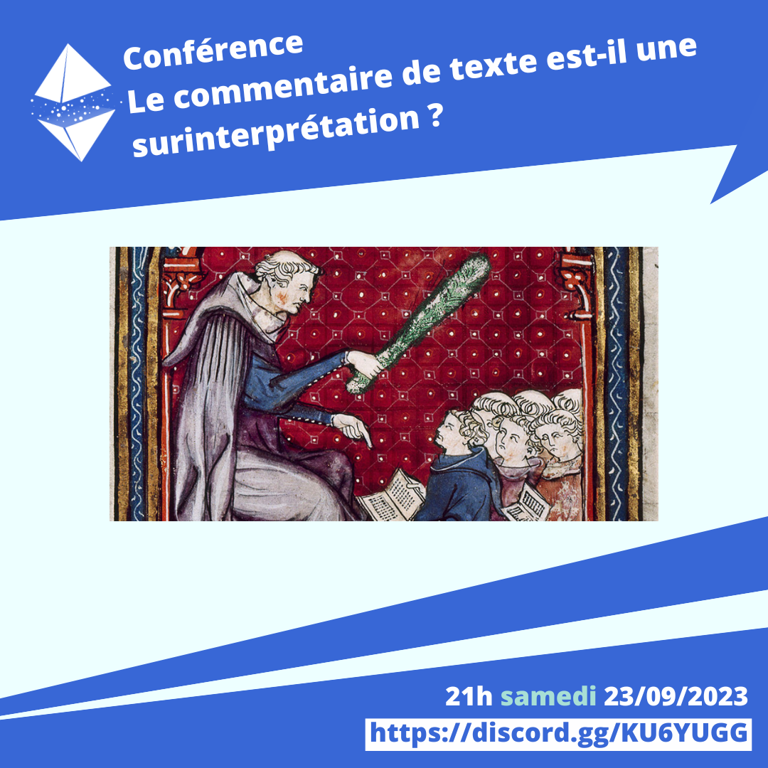 Qui ne s'est jamais demandé, lorsqu'un professeur commente un texte littéraire, si son auteur avait bien conscience d'utiliser une métaphore ? Ou si l'auteur avait réellement voulu donner tel sens à son texte ? Plus familièrement : qui ne s'est jamais demandé si le prof n'était pas un peu perché ? Nous verrons ensemble quelques arguments de critiques célèbres pour défendre l'exercice de l'interprétation et du commentaire littéraires, tout en leur donnant un cadre. Peut-être serons-nous même amenés à donner priorité à l'interprétation du lecteur sur l'intention de l'auteur... Montaigne ne déclare-t-il pas dans ses Essais : « Un suffisant lecteur découvre souvent aux esprits d’autrui des perfections autres que celles que l’auteur y a mises et aperçues, et y prête des sens et des visages plus riches. » ?