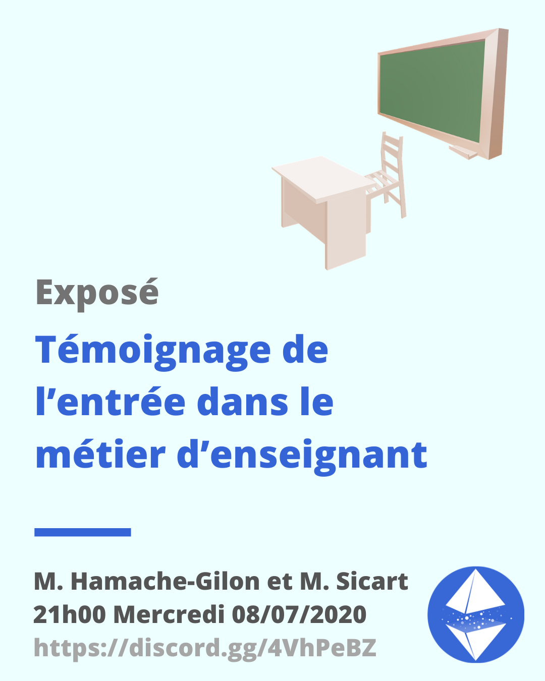 Avec la mise à jour du serveur et du bot de ce Week-end, nous avons décidé d'instaurer des exposés/conférences toutes les 2 semaines pour commencer. Ces conférences peuvent porter sur tous les sujets. Ces conférences se dérouleront de la manière suivante : - 1 ou 2 conférencier(s) - Les personnes qui seront présentes seront mute pendant la conférence (durée variable mais environ 30 ou 45min mais pourront réagir en direct dans un salon dédié. - Après la conférence, un temps de question/réponse est prévu avec le(s) conférencier(s) en vocal. Ceux qui veulent préparer une conférence/un exposé me contacter en MP pour qu'ils aient accès à la catégorie du serveur pour présenter leur ébauche/thème d'article dans le but d'en parler avec les autres conférenciers. - Nous réfléchissons à enregistrer ces conférences et à les rediffuser sur YouTube. Pour préparer le premier qui aura lieu ce samedi 2 novembre 2019, nous vous demandons de nous dire quelle heure vous préférez dans le salon sondage-reponse . Je reposterai le sondage demain. Merci à tous d'y répondre pour préparer au mieux la première conférence ;) Maxime
